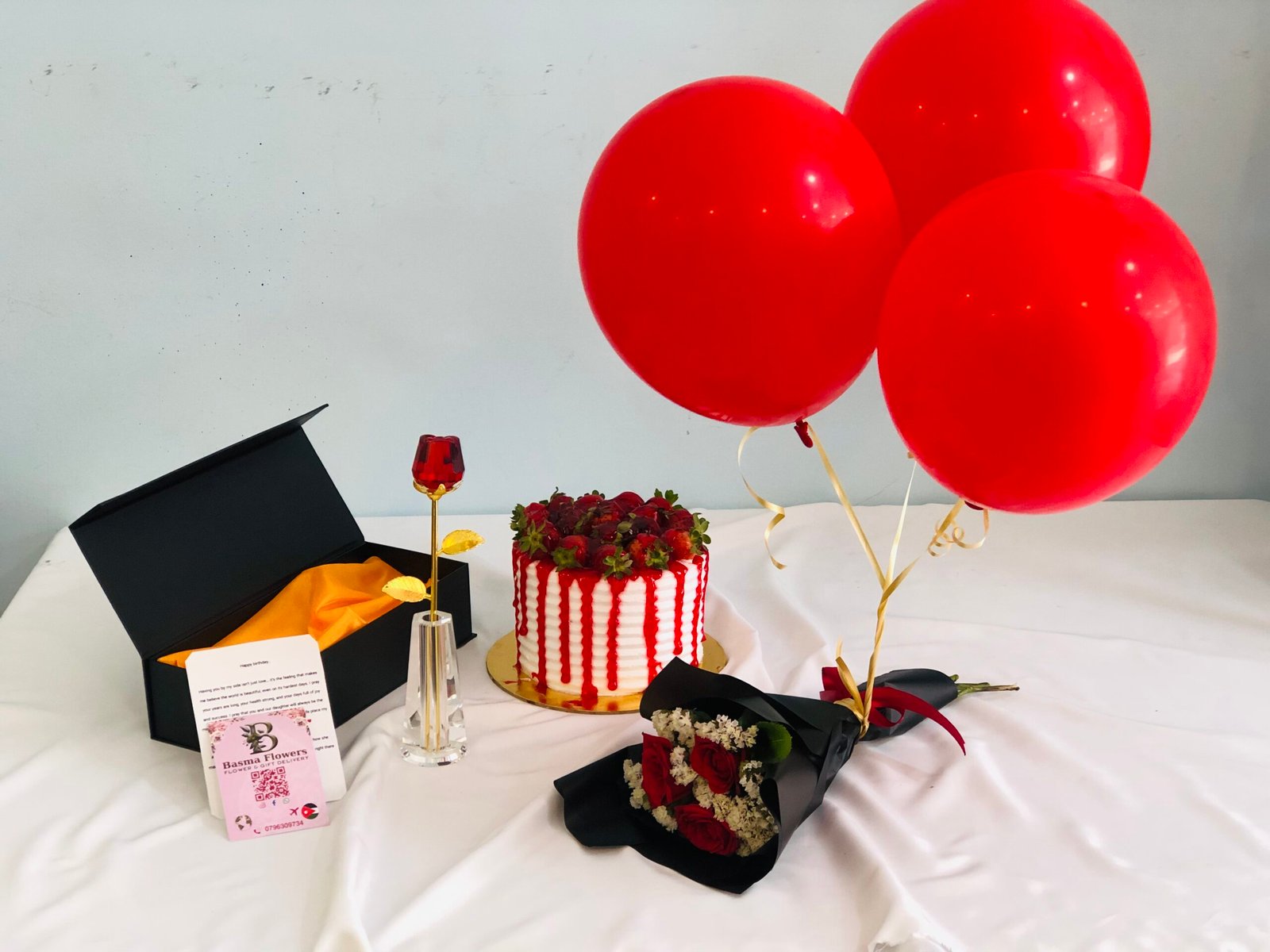 بكج الحب ورد جوري وردة الكرستال الفاخرة وكيك 6 اشخاص وبالونات